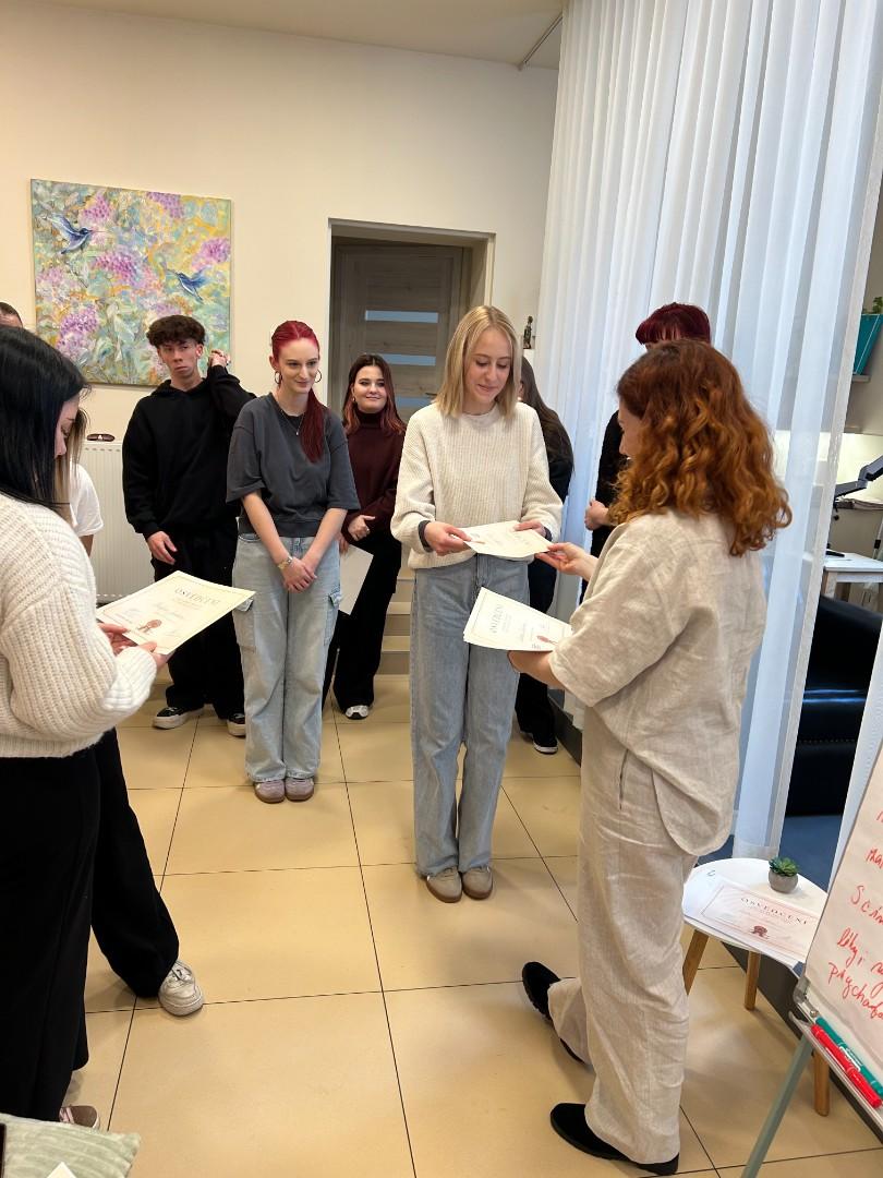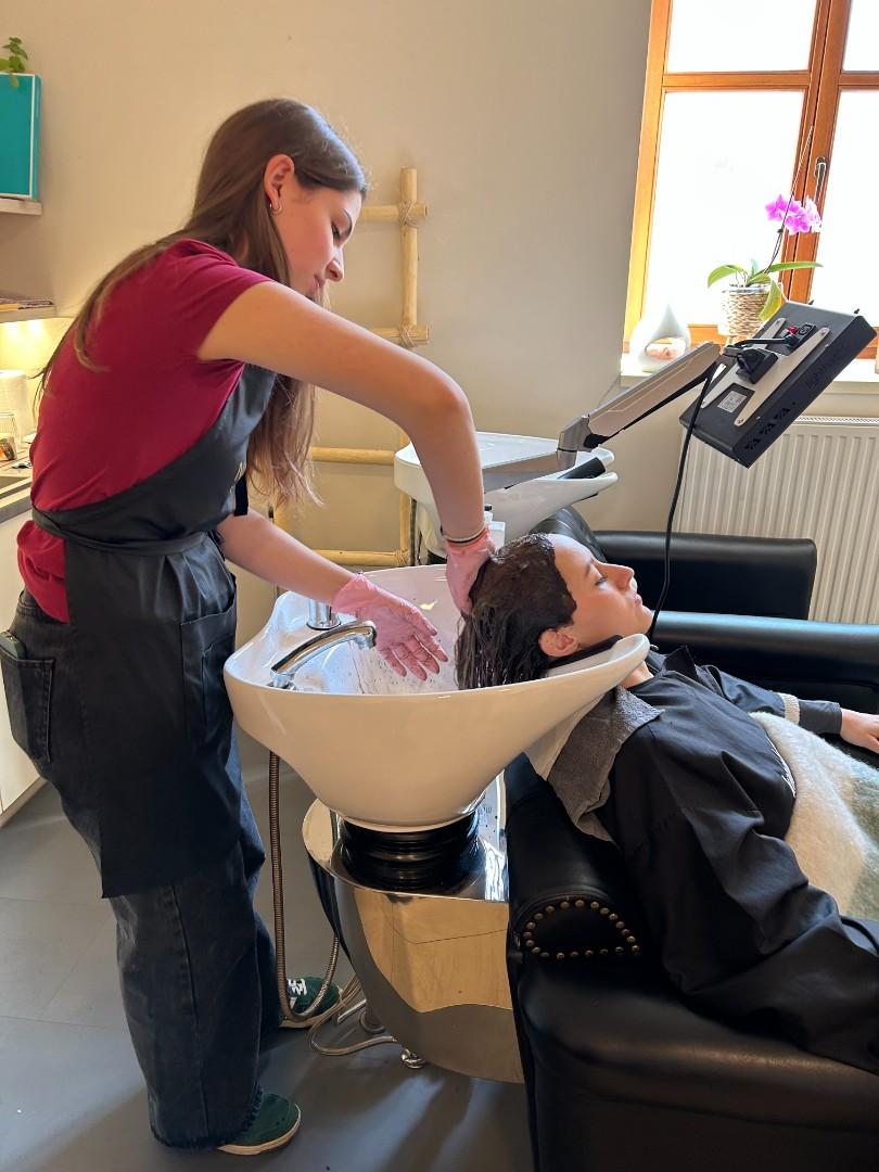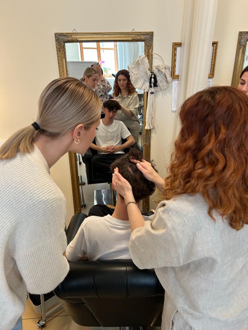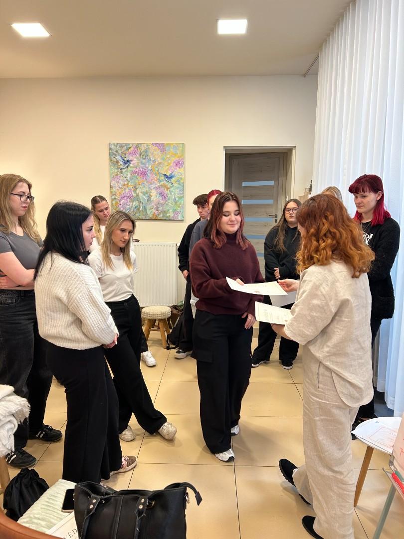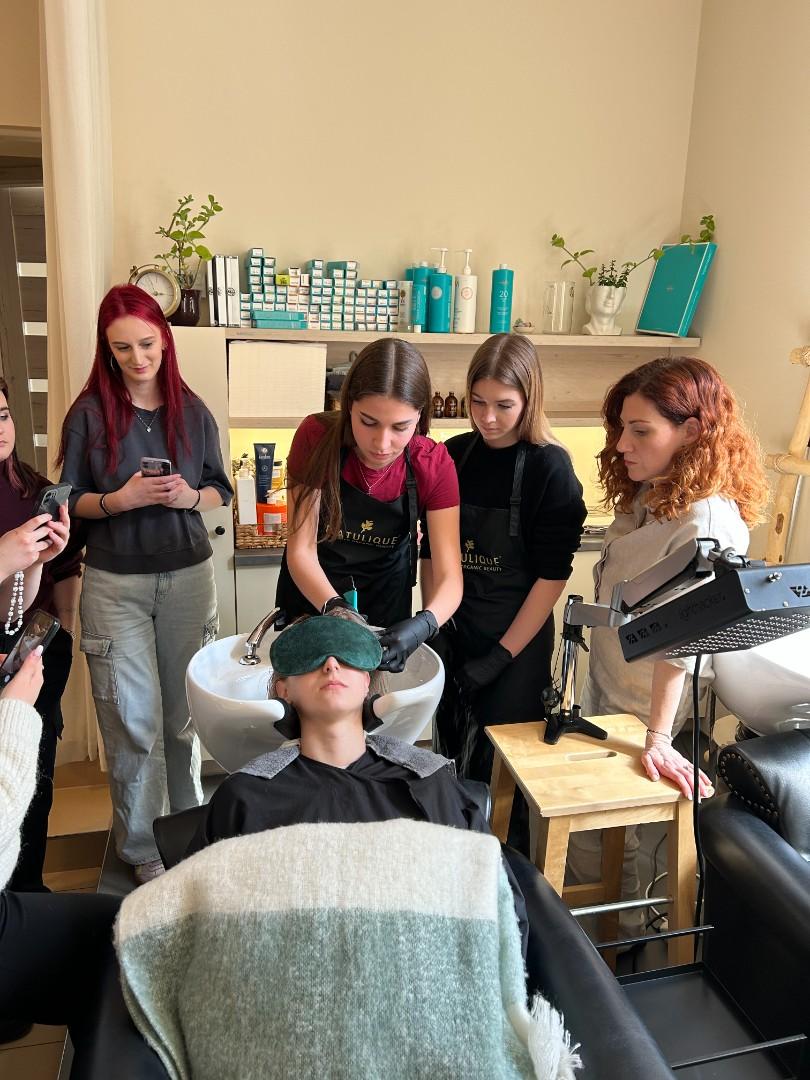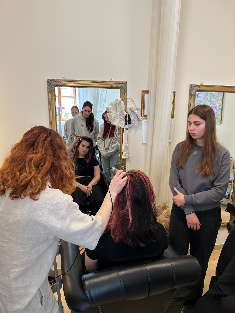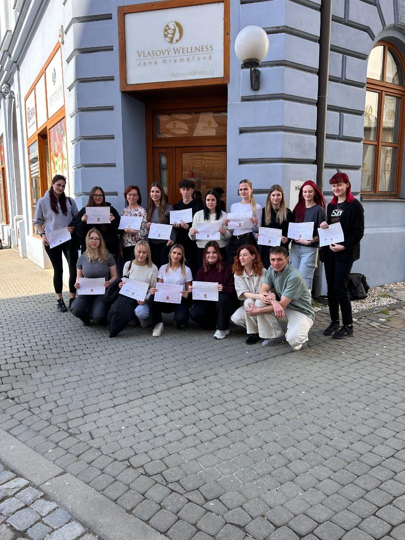 V pátek 20. března navštívila třída nástavbového studia 1.ročník Vlasové wellness Jany Ullrichové v Uherském Hradišti, aby se prakticky seznámili s prováděním trichologického vyšetření a přístrojovou diagnostikou zdravotních problémů. Viděli práci s mikrokamerou, mohli si vyzkoušet aplikaci rašelinové masky při detoxikaci vlasové pokožky. Slyšeli o vlivu vnitřního zdraví na kvalitu vlasů.